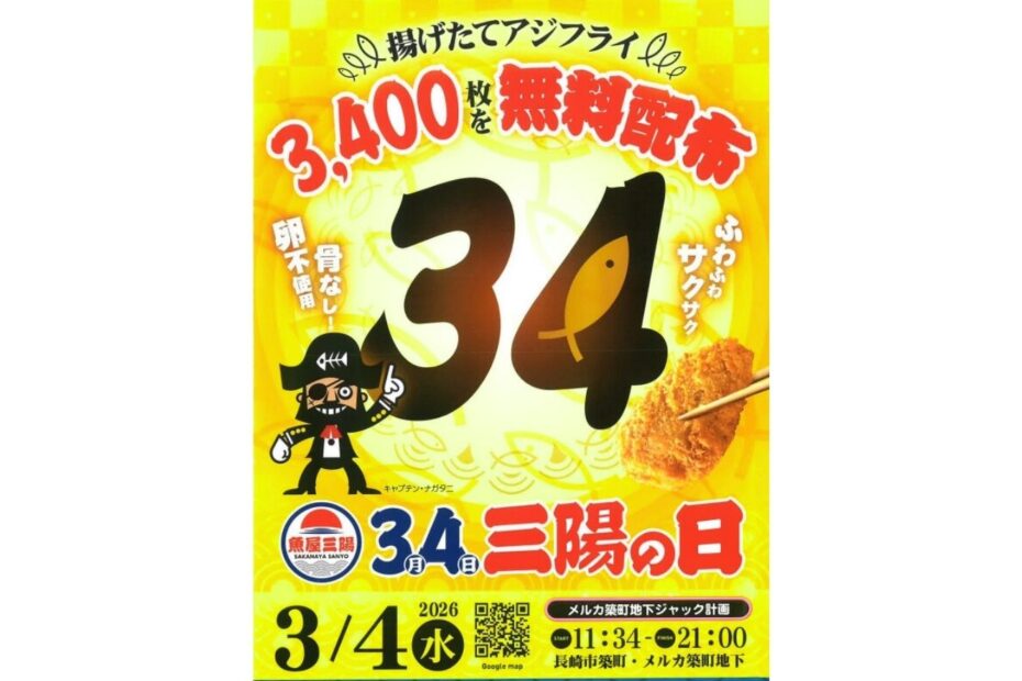 3/4は築町が大チャンス!by all_assist2026-02-272026-02-27 3/4は築町が大チャンス!長崎市築町・メルカ築町地下で 3,400枚のアジフライ無料配布!時間は 11:34〜21:00。 数量限定なので、気になる方はぜひお早めに!この日だけの特別企画、ぜひ足を運んでみてください!